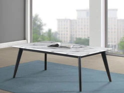 Treat your decor to a luxe, glamorous update. This stunning, rectangular coffee table makes any living room look a bit more upscale. The smooth tabletop is crafted of faux marble in elegant shades of black and white. The long, slim, angled legs add a mid-century modern vibe that brims with classic character. Pair this piece with a matching end table to beautifully complete your space.