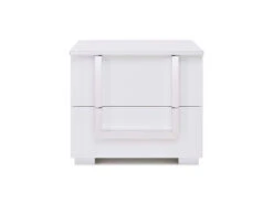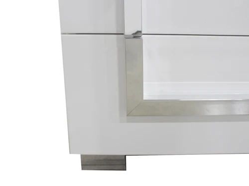The Antonella set offers a sleek, luxury atmosphere to your bedroom, showcasing white high-gloss Italian lacquer accented by aluminum edges on the headboard and around the edges of the case goods, and unique, contemporary chrome handles. The bed enhances the brilliance of this bedroom set with its headboard embellished with LED lighting that brings out the beautiful, modern gloss of the white fronts, adding an aura of glamour.