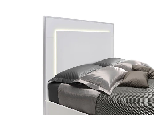 The Antonella set offers a sleek, luxury atmosphere to your bedroom, showcasing white high-gloss Italian lacquer accented by aluminum edges on the headboard. The bed enhances the brilliance of this bedroom set with its headboard embellished with LED lighting that brings out the beautiful, modern gloss of the white fronts, adding an aura of glamour.
