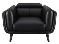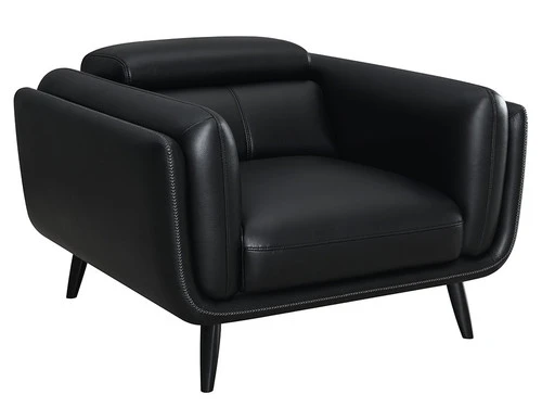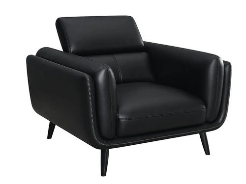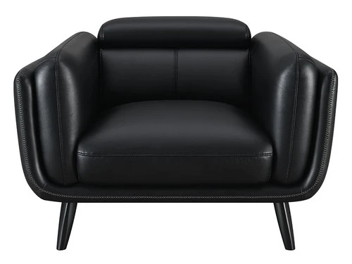 This elegant, retro-inspired modern chair is destined to bring a bold look to corners and seating areas. The tuxedo-inspired frame presents an extra plush padding of double track shelter arms, a tall back and attached seat cushion. Upholstered entirely in a smooth black leatherette with contrast cross-stitching and top stitching details, this charming chair makes itself at home in stylish entertainment rooms and beyond. Flared legs bring out the vintage elements and lend a mid-century modern hat tip. An impressive addition to entertainment rooms and more.