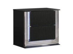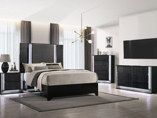 Elegant styling and a sleek exciting design are the details of the Aspen Colletion. The Bed is Black with complementary ridge trim detail, which together create a smart and sophisticated look that will enhance many room settings/decor choices. Tapered panel style legs that continue the versatile and delightful visual aesthetic of this bed. LED Lighting on every piece makes your inner sanctum like none other. A gentle push on the fluted, black lacquer fronts opens the generous storage drawers without the need for traditional pulls. This colletion is the perfect choice to update your bedroom and create a sanctuary of comfortable and inviting relaxation for your home for years to come.