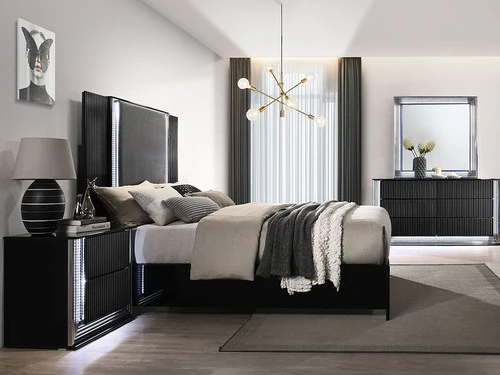 Elegant styling and a sleek exciting design are the details of the Aspen Colletion. The Bed is Black with complementary ridge trim detail, which together create a smart and sophisticated look that will enhance many room settings/decor choices. Tapered panel style legs that continue the versatile and delightful visual aesthetic of this bed. LED Lighting on every piece makes your inner sanctum like none other. A gentle push on the fluted, black lacquer fronts opens the generous storage drawers without the need for traditional pulls. This colletion is the perfect choice to update your bedroom and create a sanctuary of comfortable and inviting relaxation for your home for years to come.