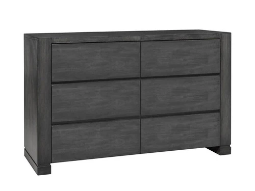 Embrace a clean linear look of simplicity by completing a bedroom space with this three-piece bedroom set. Constructed of sustainable hardwood from rubberwood plantation lumber, this set reflects a trending commitment to eco-friendly living. Bring a cool dark gray finish into a room for versatility and style. Anchored by a grand bed attached to a high headboard and upgraded with paneled sections, this set delivers a sophisticated aura. The set includes a bed, a nightstand, and a dresser.