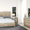 Embrace a clean linear look of simplicity by completing a bedroom space with this four-piece bedroom set. Constructed of sustainable hardwood from rubberwood plantation lumber, this set reflects a trending commitment to eco-friendly living. Bring a cool dark gray finish into a room for versatility and style. Anchored by a grand bed attached to a high headboard and upgraded with paneled sections, this set delivers a sophisticated aura. The set includes a bed, a nightstand, a dresser, and a mirror.
