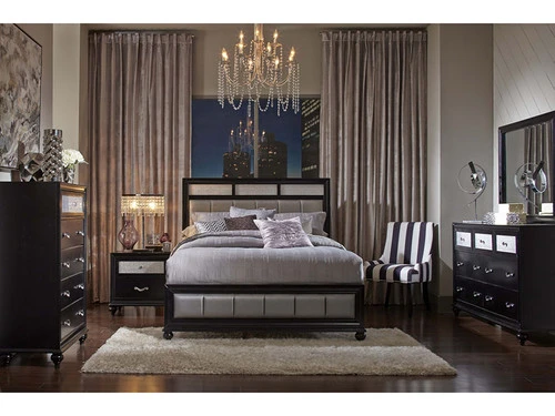 Inject some rock n’ roll glam into your bedroom with Barzini Collection. The pieces are constructed of Asian hardwood and veneers in a bold, black finish. This finish is paired with a unique and elegant metallic leatherette upholstery adorning bed and casegoods that not only does this add intriguing style, but makes for a comfortable headrest as well.