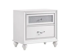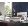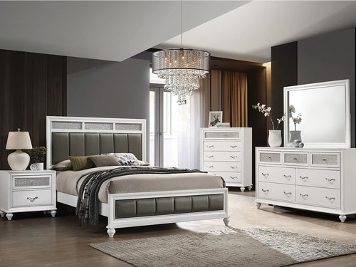 Inject some rock n’ roll glam into your bedroom with Barzini Collection. The pieces are constructed of Asian hardwood and veneers in a bold, white finish. This finish is paired with a unique and elegant metallic leatherette upholstery adorning bed and casegoods that not only does this add intriguing style, but makes for a comfortable headrest as well.