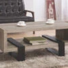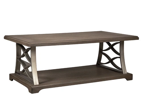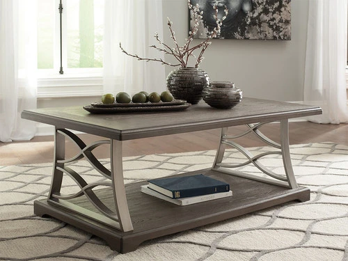 Part cool contemporary. Part richly rustic. The Baymore coffee table serves up a beautiful balance of mixed media style. The table’s plank-effect surfaces with wire brush veneers are treated to a touch of gray for a hint of weathered character. Crafted of aged pewter-tone metal, the double X-brace supports are a unique twist.