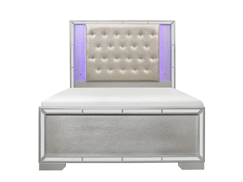 Elegant touches abound with the design of the Belfast Collection. Alligator embossed veneer covers the collection and is finished in silver, an elegant palette that beautifully pairs with your bedroom’s accessories and bedding. The headboard is centered with a silver faux leather panel that features button tufting and LED backlighting. Each piece of the collection is framed with mirror trim, each accent a perfect decorative touch to reflect your glamorous style.