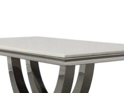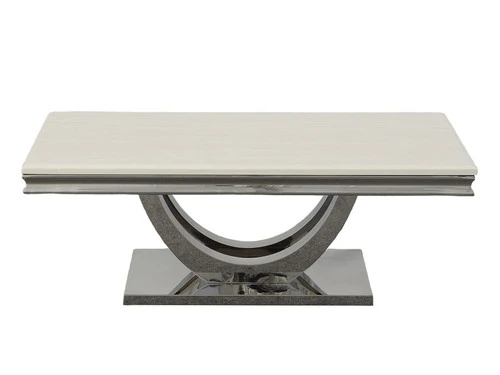 Collins Coffee Table is stunning for your room. This table includes a genuine marble top and polished stainless for a sleek, smooth look. Silver legs are fashioned in a ring-like circular design atop two silver-tiered bases. Enjoy years of everyday use with this modern yet timeless design