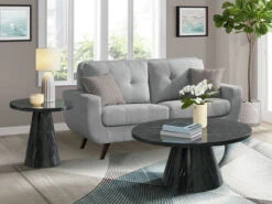 Give your room an upscale boost with the addition of Coffee & End Table set. The beautifull top made from faux marble and the sleek base cone shaped has a sculptural look for added aesthetic in any room. Tables built with solid rubber wood.