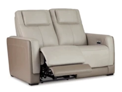 Double down on sleek style with this power reclining package. It has a streamlined, space-conscious appeal, with two-tone upholstery in neutral hues creating subtly striking visual intrigue. And with one-touch reclining, adjustable headrests and wireless charging, this set combines contemporary function and fashion in a clean-lined design.