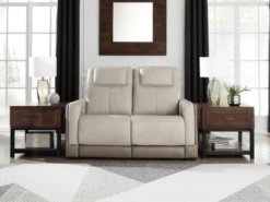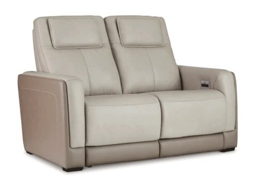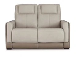 Double down on sleek style with this power reclining loveseat. It has a streamlined, space-conscious appeal, with two-tone upholstery in neutral hues creating subtly striking visual intrigue. And with one-touch reclining, adjustable headrests, and wireless charging, this piece combines contemporary function and fashion into a single clean-lined design.
