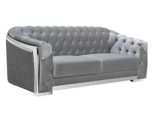 High style meets modern day living. Take notice of the quilting on the outside arms and backs of the sofa. This allows you to float the piece in an open floor plan room. The button tufting on the arm panels, inside arms and backs adds style and comfort for such a modern look. The velvet fabric has that smooth and soft feel and comfort which adds to the beautiful design. The curved chrome outside framing is the final touch in this beautiful execution high style modern design.