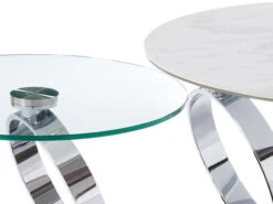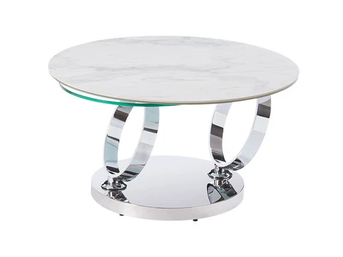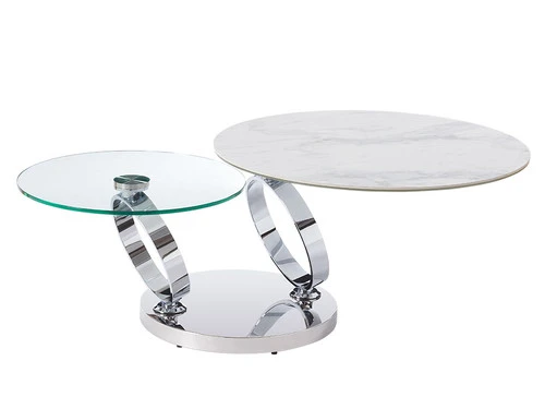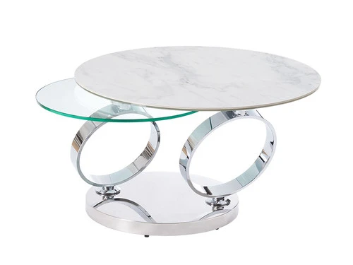 Exquisitely designed to epitomize sophistication and endurance, this round dual-tiered table seamlessly marries a crystal-clear tempered glass tabletop with a lustrous polished stainless steel base. The connecting rings, elegantly finished in chrome, add a touch of modern flair.