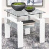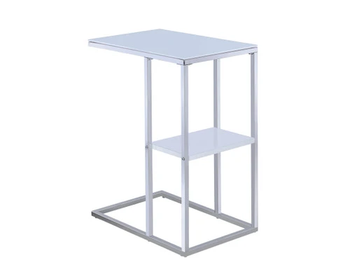 Transform a living room with the delicate charm from this white snack table. Featuring a classic and open silhouette, the sleek legs are complete with a built-in shelf that sets it apart from the rest. Light hues create a soft visual in any living room. Do light work from the sofa or enjoy a hands-free popcorn during a movie with the versatility of the modern design. Rectangles of different sizes combine to construct the sides, base, and top.
