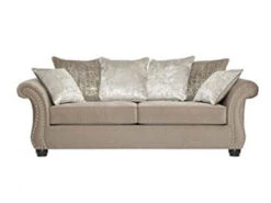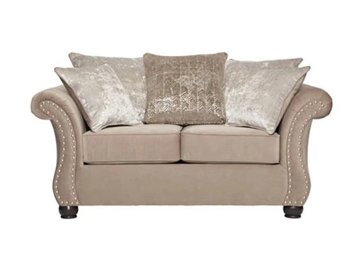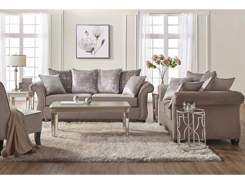 The Cosmos Putty sofa set features transitional style design, upholstered in a cosmos putty fabric, flared padded rolled armrests, bun style legs, nailhead trim accents, welting trim, velvet throw pillows included.