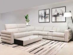 Introducing the Damian Sectional with Power Recliners and Console – the ultimate multi-functional sofa solution. This modern sectional boasts power recliners, a built-in console with cupholders, and a hidden sleeper unit. Its unique linear padded arm design adds a touch of sophistication, while the plush upholstery ensures exceptional comfort. Stylish, comfortable, and versatile, it’s the perfect addition to elevate your living space. Whether you’re entertaining guests or relaxing with family, the Damian Sectional offers everything you need for a luxurious and enjoyable experience.