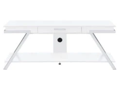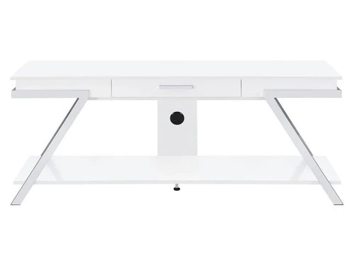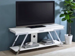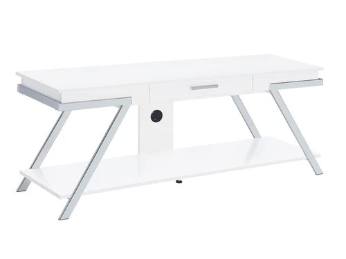 Fresh, inspired design turns your casual home into a haven for easy style with a novel design in a TV stand. Prep a media or entertainment room with this ultra-contemporary stand made of white high gloss finish MDF with paper coating. Angular metal framing adds a cool aesthetic boost. A modular-like configuration and aesthetic works well in updated casual rooms, with a spacious upper surface and lower shelf. A single center drawer stashes incidentals.