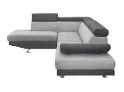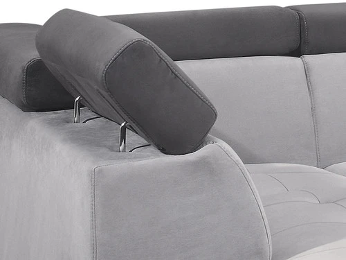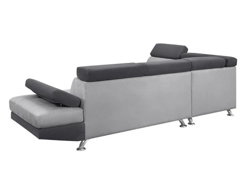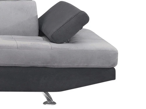 The sectional is designed with clean lines for a look that invites comfort and the heart of home. This attractive two-tone sectional is upholstered in a velvety fabric. The wide, low-profile arm lifts up for additional support and the adjustable headrest for relaxing after a long day. Finished in light and dark gray, it features spacious seating, an angled design and sleek chrome metal legs.