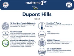 The superior support found in the Dupont Hills Firm coupled with its two gel foam upholstery layers will offer those looking for a “firm bed with firm support” a tremendous value for their bedding dollar. The foam-encased Firm design provides more edge to edge sleeping surface and helps prevent excess edge compression that can occur after years of sitting on the side of your bed. The Dupont Hills Firm is adjustable base friendly.