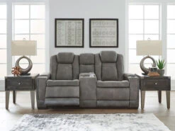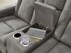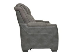 This sleek, ultra-modern power reclining Loveseat has it all. With designer looks and head-to-toe comfort, it has the upscale look of leather at a scaled-down faux leather price. Its gray two-tone upholstery is more durable and water-repellent than regular leather, an added bonus for families with children or pets. Features including wireless and USB charging, an adjustable headrest and a “zero-gravity” ottoman for improved circulation make this the next generation of power recliners.