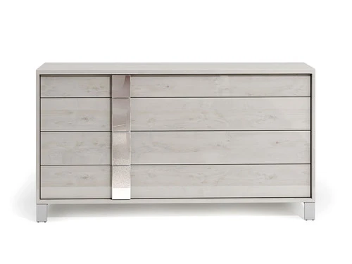 The stunning wood finish covered in a Ash high gloss lacquer and mirror combination is the foremost feature of this modern style collection and give it a reserved glamour. The asymmetry of the design is defined by the mirrored handles and the inlays on the headboard. Coupled with the raised case goods on top of contemporary stainless-steel feet, the overall clean lines make the Emma bedroom set a highly functional and very appealing set. Stunning design, quality and workmanship is visible in each fine detail of this contemporary bedroom set.
