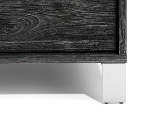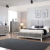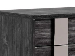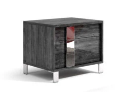 The stunning wood finish covered in a Pewter high gloss lacquer and mirror combination is the foremost feature of this modern style collection and give it a reserved glamour. The asymmetry of the design is defined by the mirrored handles and the inlays on the headboard. Coupled with the raised case goods on top of contemporary stainless-steel feet, the overall clean lines make the Emma bedroom set a highly functional and very appealing set. Stunning design, quality and workmanship is visible in each fine detail of this contemporary bedroom set.