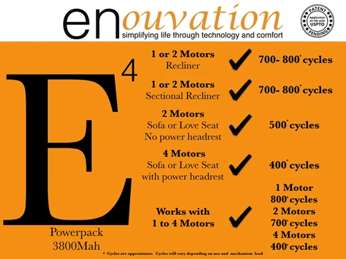 The E4 Power Pack from Enouvation offers you the ability to CUT THE CORD on Power Motion furniture. This gives you the ability to float a Power Motion piece of furniture without having to see those unsightly, industrial cords. The E4 will give your Sofa with Power Headrests approximately 400 cycles and Recliner 800 cycles before having to recharge. Enouvation Power Packs are tested to multiple UL standard and certified, having gone through rigorous testing. They are the most efficient battery in the marketplace with twice the power, half the size. Each Power Pack comes with its own charger in box. Contents: 1 Enouvation Power Pack 1 Enouvation Charger 1 Product Instruction Sheet