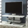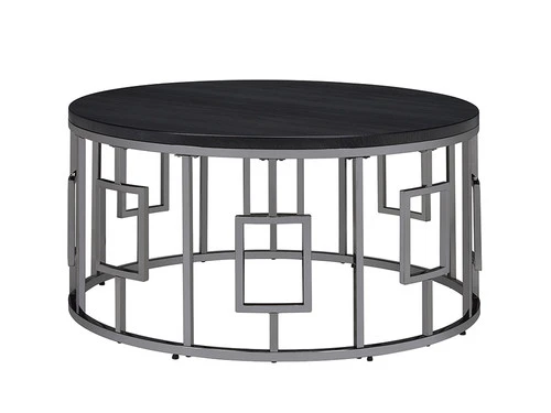 This Ester round coffee table features a chrome metal base, intricate design along table base, and a wooden table top in a sleek, black finish.