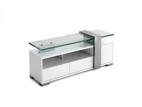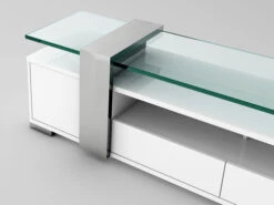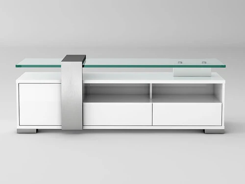 Fortaleza Tv Unit in white high gloss finish, clear glass top, brushed stainless steel trim, 2 drawer and 1 doors. Has Plenty Of Storage Space and An Open Media Shelf with Cable Management. Ideal TV stand, cabinet for small space.