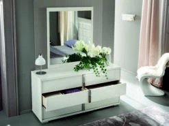 The Imperia Bedroom is an exquisite and ultra modern Collection, high gloss white wood veneer surface, with the highest quality lacquered veneers, and chrome accents that reflects natural light. Casegoods include convenient easy touch closure and drawer stops, Exclusive design, engineering and craftsmanship to the highest of standards MADE IN ITALY collection that will delight your senses.
