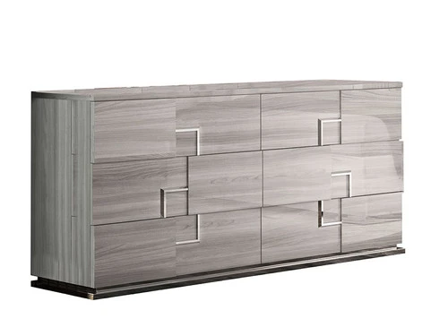 The Infinity Bedroom Set is the newest trend-setting collection. The simplicity of the monochromatic glossy Gray color balance the visual movement created by the tiles placed on top of the front panels. The L-shaped metal handles have the same depth as the tiles and complement the check design with symmetric geometric forms that go left-right and top-bottom. Nightstands and dresser are scaled to stretch out and be in harmony with the extended headboard. Gray glossy color and stainless-steel finish are classic in modern design. All drawers are equipped with high-quality, soft, self-closing, under-mount slides with stop safety features to prevent a full extraction. The smooth and firm opening and closing movement of the drawers convey a sense of luxury. Drawers are completely lined with fabric-like material that is scratch and stain-resistant. The bedsides and footboard are assembled with cam-lock hardware that guarantees precision and sturdiness.