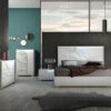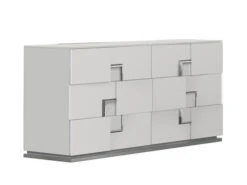 The Infinity Bedroom Set is the newest trend-setting collection. The simplicity of the monochromatic glossy white color balance the visual movement created by the tiles placed on top of the front panels. The L-shaped metal handles have the same depth as the tiles and complement the check design with symmetric geometric forms that go left-right and top-bottom. Nightstands and dresser are scaled to stretch out and be in harmony with the extended headboard. White glossy color and stainless-steel finish are classic in modern design. All drawers are equipped with high-quality, soft, self-closing, under-mount slides with stop safety features to prevent a full extraction. The smooth and firm opening and closing movement of the drawers convey a sense of luxury. Drawers are completely lined with fabric-like material that is scratch and stain-resistant. The bedsides and footboard are assembled with cam-lock hardware that guarantees precision and sturdiness.