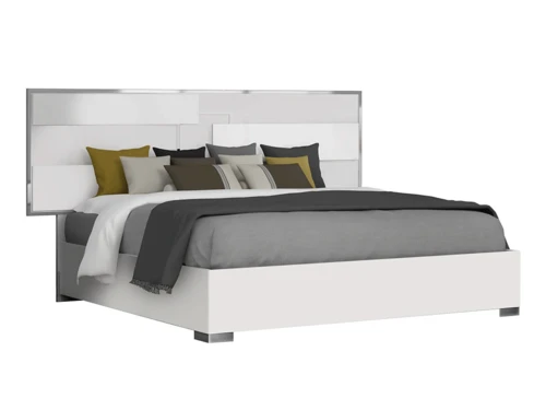 The Infinity Bed is the newest trend bed. The simplicity of the monochromatic glossy white color balance the visual movement created by the tiles placed on top of the front panels. The L-shaped metal has the same depth as the tiles and complements the check design with symmetric geometric forms that go left-right and top-bottom. White glossy color and stainless-steel finish are classic in modern design. The bedsides and footboard are assembled with cam-lock hardware that guarantees precision and sturdiness.