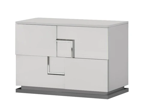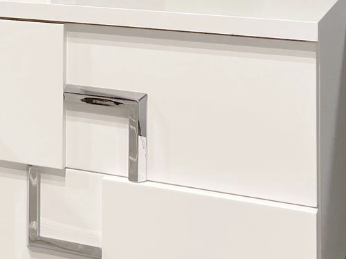 The Infinity Bedroom Set is the newest trend-setting collection. The simplicity of the monochromatic glossy white color balance the visual movement created by the tiles placed on top of the front panels. The L-shaped metal handles have the same depth as the tiles and complement the check design with symmetric geometric forms that go left-right and top-bottom. Nightstands and dresser are scaled to stretch out and be in harmony with the extended headboard. White glossy color and stainless-steel finish are classic in modern design. All drawers are equipped with high-quality, soft, self-closing, under-mount slides with stop safety features to prevent a full extraction. The smooth and firm opening and closing movement of the drawers convey a sense of luxury. Drawers are completely lined with fabric-like material that is scratch and stain-resistant. The bedsides and footboard are assembled with cam-lock hardware that guarantees precision and sturdiness.