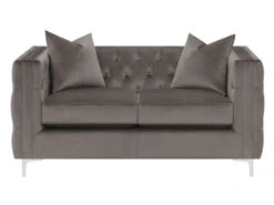 Transform your contemporary living room with this modern glam seating area, complete with a sofa and loveseat. Designed with Tuxedo-like frames, this modern glam sofa and loveseat are upholstered in a soft urban bronze velvet, lending a cozy seat and an earthy neutral color palette. Taught button-tufted backrests and wide track arms offer a flush silhouette that you can really sink into. Below the welted box seat cushions and frame are supportive metal bracket legs in a cool tone metallic finish that create a chic and sophisticated final touch. Matching throw pillows soften the edgy corner interiors.