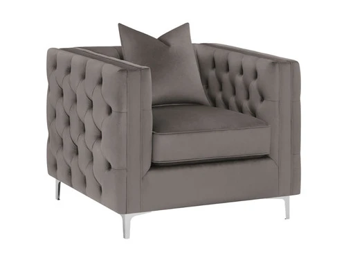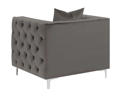 Elegantly tailored upholstery, framed in beautiful deep button tufted velvet. Double row of self welt trim de-tails tufted arm design. Reversible boxed seat cushions accented in self welt Stylish silver metal legs