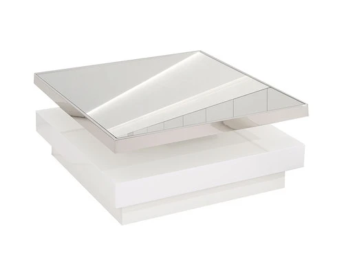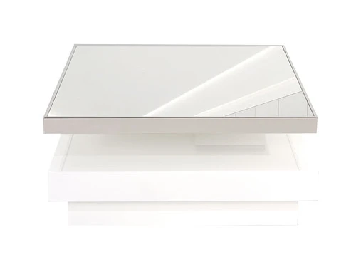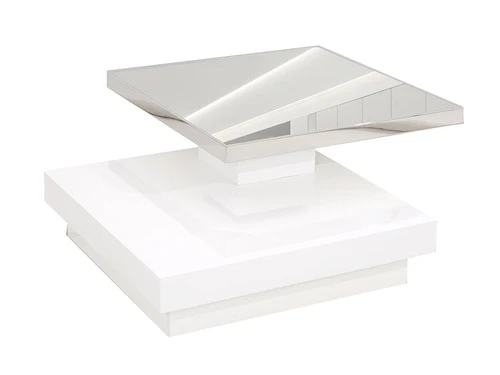 Kavala Swivel Coffee Table features a high gloss white lacquer finish with polished steel accent and a Mirrored top.