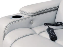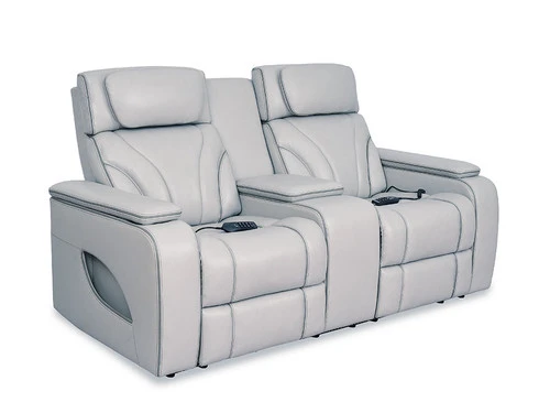Zero Gravity Loveseat, Four-bladder air massage with heat, storage, arms with lighted cupholders, base rail lighting, ambient lighting inside arm cavity and on drop down table. This feature combined with therapeutic air massage and heat provides a more enjoyable and effective massage, creating the ideal amount of pressure on the lower back when in full recline, the power headrest allows customers to position themselves to comfortably watch TV, have a conversation, read a book or enjoy their favorite leisure activity. The arm rest ratchets forward and backward to cover the cupholder when not in use.