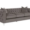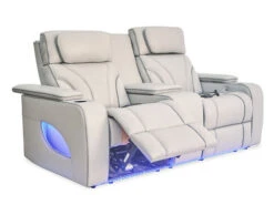 – Sofa features a drop-down table with LED reading lights, an A/C power port, cup holders, USB ports.