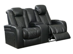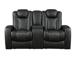 This Loveseat will be your favorite place to relax and enjoy with the Lisboa Loveseat Power Recliner. This Loveseat comes in black leatherette upholstery with diamond accent quilting and contoured bucket seating for extra support and comfort, in a modern look. When it comes to comfort, you’ll love the reclining bucket seat and its power-adjustable headrest that offers a custom comfortable angle for watching TV. It’s also convenient: illuminated cup holders, built-in power button with USB port on the controller, flip-up padded armrest with hidden storage. It is sure to become a hit in any home.