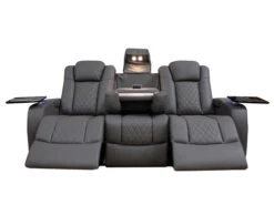 This Sofa will be your favorite place to relax and enjoy with the Lisboa Sofa Power Recliner. This Sofa comes in Gray upholstery with cross stitching , lattice detailing, with a modern look. This Sofa comes in black upholstery with cross stitching, lattice detailing, and a modern look. When it comes to comfort, you’ll love the reclining bucket seat and its power-adjustable headrest that offers a custom comfortable angle for watching TV. It’s also convenient: illuminated cup holders, built-in power button with USB port on the controller, flip-up padded armrest with hidden storage. It is sure to become a hit in any home.