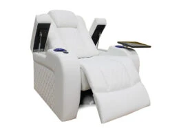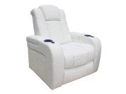 This Recliner will be your favorite place to relax and enjoy with the Lisboa Power Recliner. This Recliner comes in white upholstery with cross stitching , lattice detailing, with a modern look. This Recliner comes in black upholstery with cross stitching, lattice detailing, and a modern look. When it comes to comfort, you’ll love the reclining bucket seat and its power-adjustable headrest that offers a custom comfortable angle for watching TV. It’s also convenient: illuminated cup holders, built-in power button with USB port on the controller, flip-up padded armrest with hidden storage. It is sure to become a hit in any home.