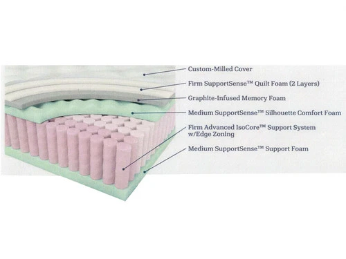 Engineered for a firm feel, balanced with ergonomic support. Perfect for those desiring cushioned comfort and a firm, supportive sleep surface. Custom-milled fabrics chosen for durability and comfort. Dual quilted layers create cradling comfort, added pressure relief. and improved durability. Delivers a comfortable sleep sm;face with firm support. Cool sleep surface and consistent comfort. Works with other mattress layers to distribute weight more evenly as you mmte, reducing partner disturbance.
