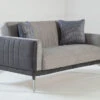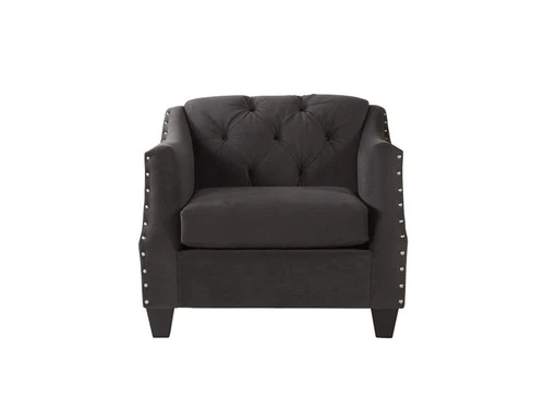 Transitional modern break front arm style in a lush velvet fabric. Some outstanding features include: reversible bench seat cushions, tufted back, pewter nail-heads and colorful patterned accents.