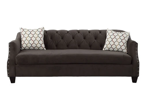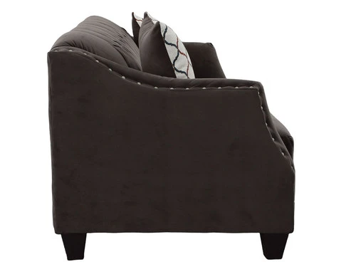 Transitional modern breakfront arm style in a lush velvet fabric. Some outstanding features include reversible bench seat cushions, tufted back, pewter nail-heads, and colorful patterned accent pillows.Â