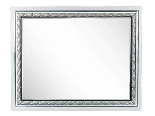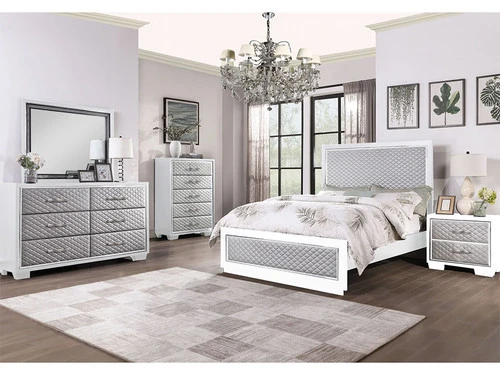 Glam up your bedroom with the sleek and stylish Luxor Collection. White frames highlight the upholstered silver drawer fronts and headboard. Gleaming silver drawer pulls with crystal inset accents make the set pop. Upholstered fronts are enhanced with diamond stitching. Crafted of Birch and Poplar solids & oak veneers, with English dovetail drawer construction and full extension glides.