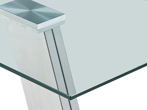 Meticulously designed for both sophistication and endurance, this table features a solitary crystal-clear tabletop gracefully joined to a shining polished stainless steel base. Elevate your living area with its stylish and adaptable design.
