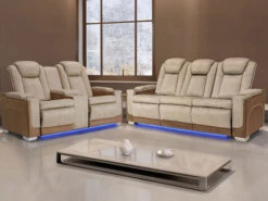 This sleek, ultra-modern power reclining sofa set has it all. With head-to-toe comfort. This double reclining sofa set is plush in all the right places and will support you for longer than you can binge-watch your favorite TV show. The sofa middle seatback drops down into the convenient table-top with cup holders, the perfect resting spot for tablets and magazines. Features including wireless and USB charging, an adjustable headrest and LED light on the bottom rail make this the next generation of power recliners.