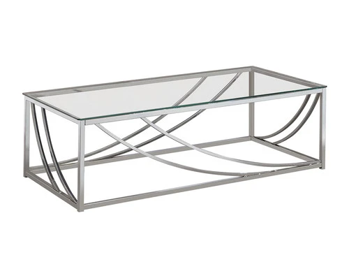 Complete with a sleek glass top, this modern coffee table oozes elegance. Add luxury with the sleek silhouette and chrome finish. Elevated with thin swoop accents, the open base celebrates modern design. Incorporate visual texture into a lush motif with the contemporary shape of this stunning table. Construct a stylish seating area with a decorative bowl or tray to organize remotes. Must sold with End Table